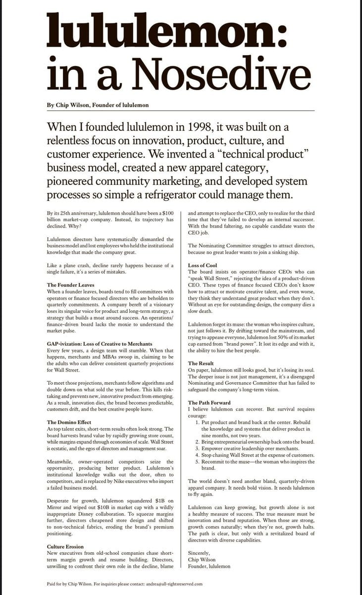 Wilson placed a self-funded advertisement in the Wall Street Journal calling out the board for prioritizing short-term metrics over the product and community focus that built the brand. He called the trajectory a "plane crash" and said the company was "in a nosedive."
